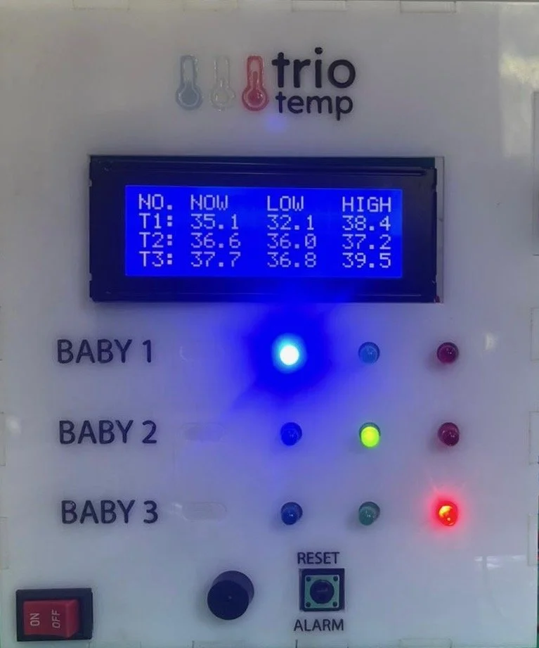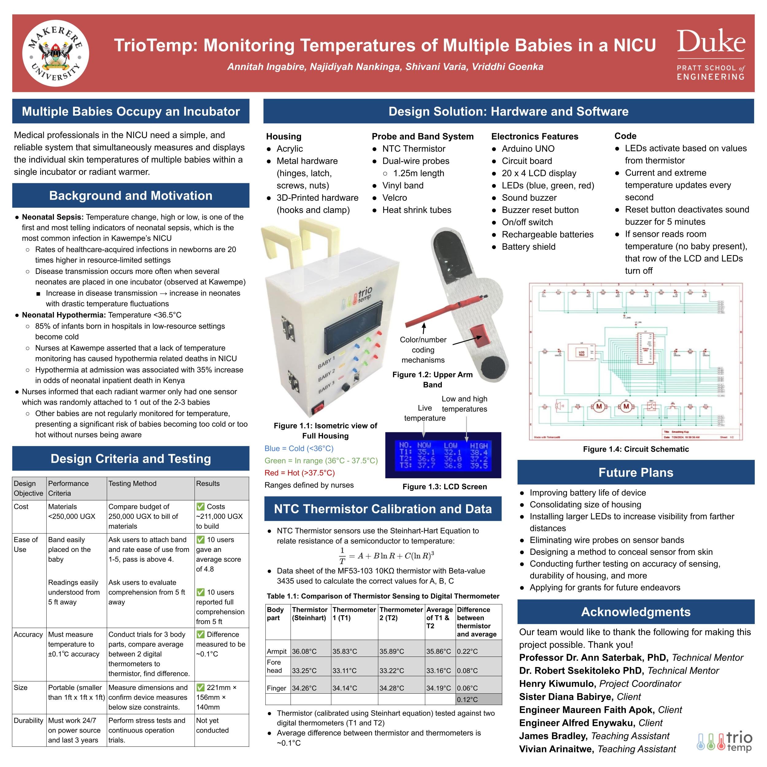 Over 8 weeks, our team of two Duke students and two Makerere students devised a solution that uses Arduino to measure and display the current, high, and low temperatures of 3 neonates. The temperature monitoring system utilizes a calibrated NTC thermistor affixed to a vinyl band fitted with velcro to be attached onto the baby’s upper arm. The acrylic casing houses the electronics, features a color coded system to identify the babies, and holds the light and sound notification systems. The lights indicate where the baby falls in pre-set temperature ranges of hot, cold, and normal. An alarm sounds when a baby enters the red or blue zones, and a nurse can reset the alarm when the baby has been attended to.